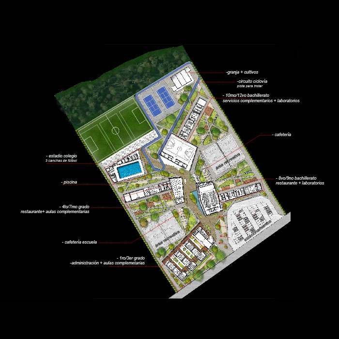 Se propone un eje longitudinal público que alimenta las 4 fases del proyecto, aquí se inicia el recorrido del proyecto desde la plaza de acceso y estacionamientos; y culmina en los equipamientos deportivos de mayor escala. Éste eje peatonal se convierte en el núcleo de la unidad educativa que además funciona como espacio de transición entre los volúmenes de aulas de las distintas fases.